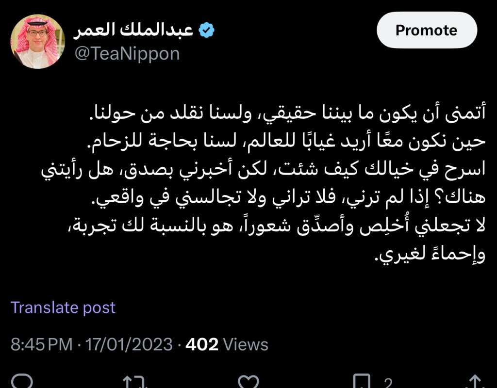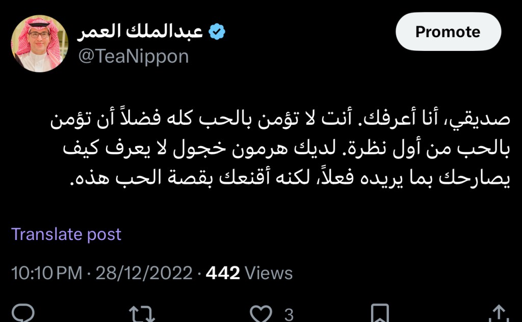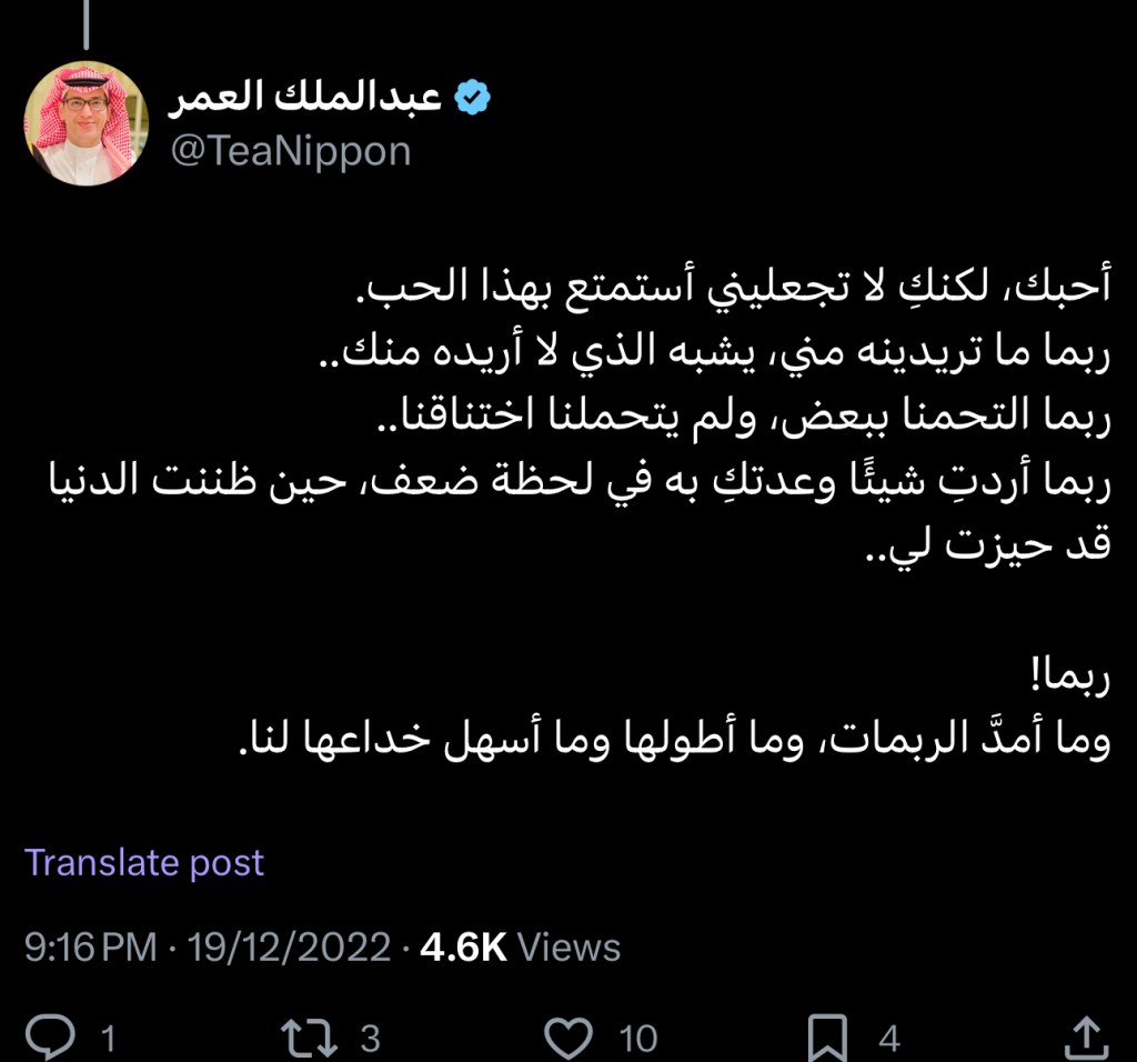 هذا الذي يحدث بين اثنين حين يكونا لوحدهما له متعة، لكن الحب لو وُجِد سيجعله جنة، هذا الالتحام له سَكْرَة لكن الحب لو وُجِد سيجعله نشوة، هذا الاتصال له غياب لكن الحب لو وُجِد سيجعله فناء.